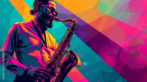 Fototapeta premium Jazz saxophonist in spotlight flat design front view cartoon drawing Triadic...