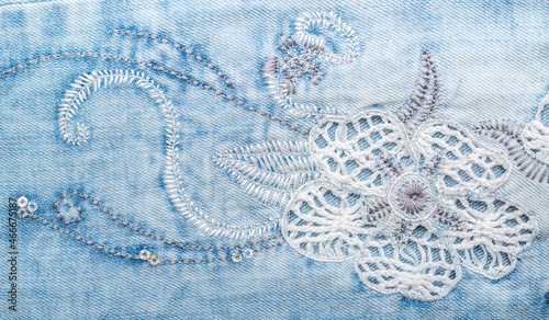 © Vera, Obraz premium Jeans background. Denim fabric closeup. Textures of clothing fabric with fashion embroidery blue colors. Copy space for text. Fashion and Style.