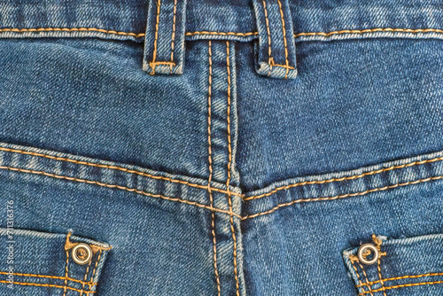 Fototapeta premium Jeans, denim close-up, seam with yellow threads.