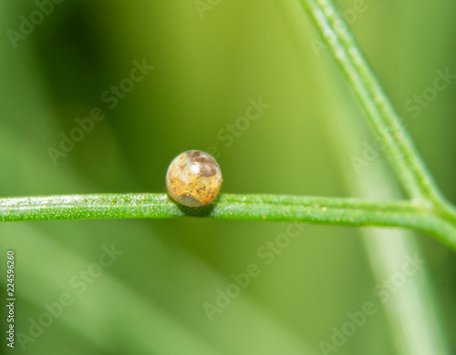 © pimmimemom, Fototapeta premium Jedno jajo motyla z czarnego Palinurusa przymocowane do delikatnego liścia kopru; z gąsienicą widoczną przez muszlę; prawie gotowy do zamknięcia