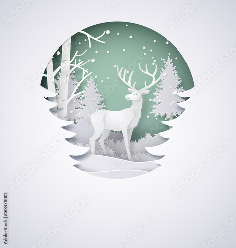 © kengmerry, Fototapeta premium Jeleń w lesie ze śniegiem w sezonie zimowym i bożego narodzenia. Styl sztuki papieru wektorowego.