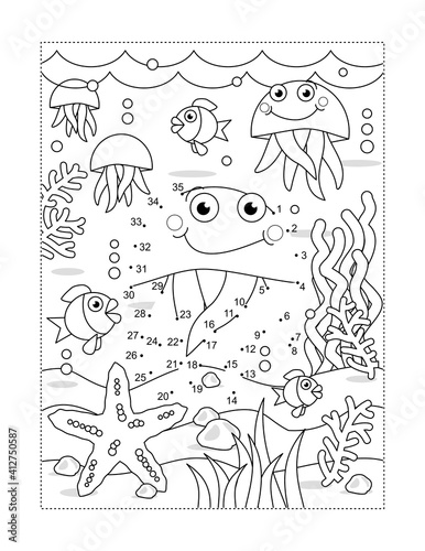 Fototapeta premium Jellyfish connect the dots full page picture puzzle and coloring page, underwater life themed, with fish, starfish, seabed, algae