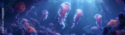 © weerayut, Fototapeta premium Jellyfish floating above seahorses in an underwater canyon, mysterious and majestic illustration style