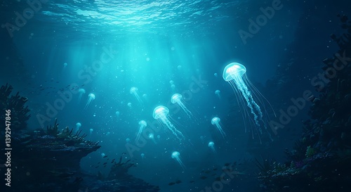 © Day, Fototapeta premium Jellyfish Floating in Deep Blue Ocean Water with Sunlight