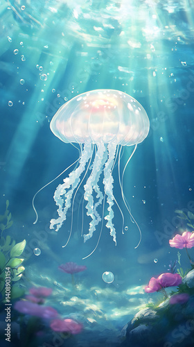 © SibteHUSSAIN, Fototapeta premium Jellyfish hovering gracefully above the ocean floor its translucent tentacles gently undulating in the water's current