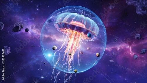 Fototapeta premium Jellyfish in Space Nebula with Planets and Asteroids