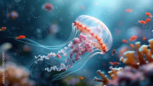 Fototapeta premium Jellyfish interacting with swarm of small, colorful fish near vibrant coral...