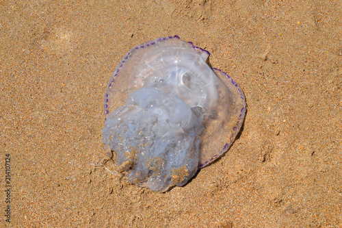 © eleonimages, Obraz premium Jellyfish Rhizostoma root rope, thrown to the shore of the sea. Dead jellyfish