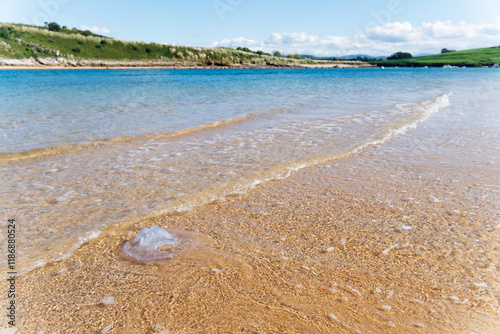 Obraz premium Jellyfish washed ashore on a sandy beach. Danger of stinging.