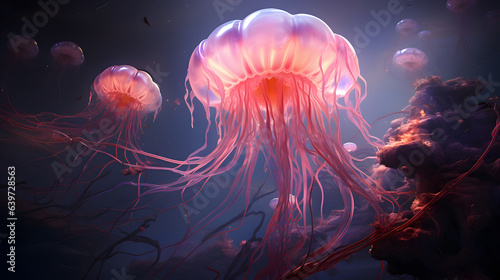 Naklejka premium jellyfishs floating in the water with a dark background Generative AI