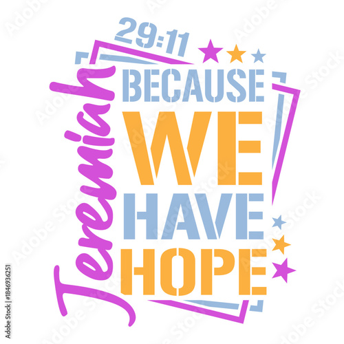 © Nixarty, Fototapeta premium "Jeremiah 29:11 Because We Have Hope" Colorful Christian Vector T-Shirt Design. Bible Verse Typography with Stencil Font and Stars.