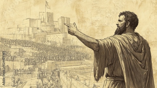Fototapeta premium Jeremiah standing on a city wall with a face filled with alarm