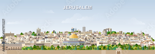 © brichuas, Obraz premium Jerusalem city skyline on gradient beautiful day sky background. Vector illustration