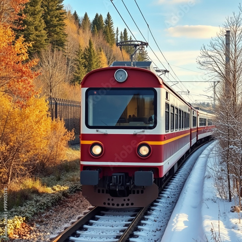 © Jacek, Fototapeta premium Jesień i zima na jednym zdjęciu z pociągiem