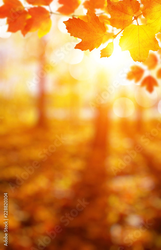 Naklejka premium Jesienne liście na słońcu i niewyraźne drzewa