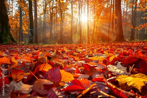Naklejka premium Jesienne liście w promieniach słońca w lesie