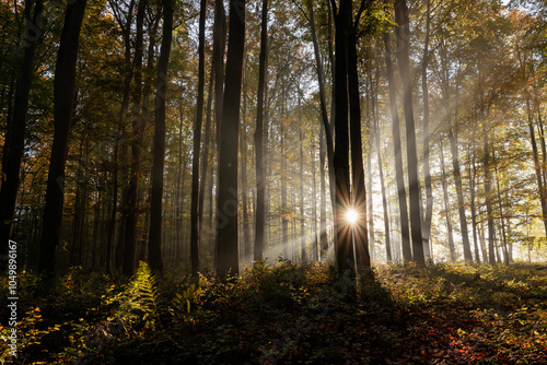 Naklejka premium Jesienny bukowy las o wschodzie słońca, we mgle z promieniami, Czechowice...