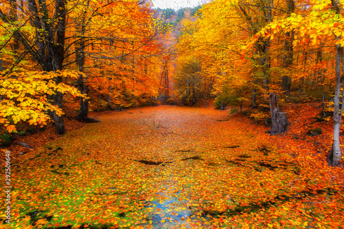© Hakan Eliaçık, Naklejka premium Jesienny czas. Liście drzew kolorowe, żółte, pomarańczowe, czerwone. Wspaniały widok. Park Narodowy Yedigoller. Stambuł, Bolu, Turcja.