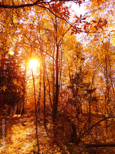 Obraz premium jesienny krajobraz las z żółtymi czerwonymi liśćmi z promieniami słonecznego...