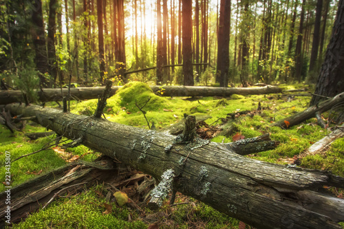 Fototapeta premium Jesienny krajobraz leśny. Jasne słońce w pięknym lesie. Ziemia porośnięta zielonym mchem. Stare suche drzewo w zielonym lesie. Niesamowity las w złotym słońcu.