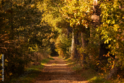 Naklejka premium Jesienny las, leśna dróżka o poranku