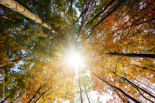 © okostia, Obraz premium Jesienny las, pnie i pożółkłe korony w promieniach słońca
