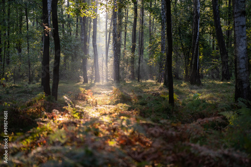 © Elżbieta Kaps, Fototapeta premium Jesienny las z mgiełką i porannym światłem, tapeta.