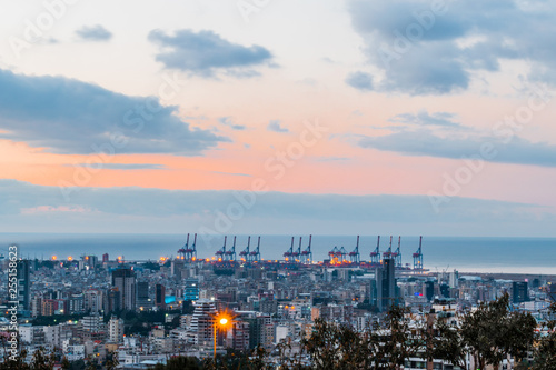 © Edds, Fototapeta premium Jest to uchwycenie zachodu słońca w stolicy Libanu w Bejrucie z ciepłym pomarańczowym kolorem i chłodną chmurą, a na zdjęciu widać port w Bejrucie.