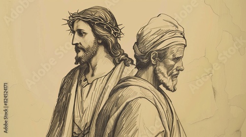 Fototapeta premium Jesus and the Rich Man Who Walked Away Sorrowful, Biblical Illustration of Wealth and Salvation, Ideal for Religious article