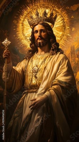Naklejka premium Jesus as a divine king, holding a scepter, adorned in golden robes and crown, radiating majesty and spiritual authority.