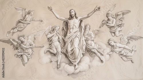 Fototapeta premium Jesus Ascending into Heaven, a Beautiful Biblical Illustration of Faith and...