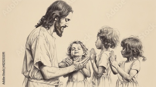 Obraz premium Jesus Blessing a Group of Children, Representing Innocence and Love, Biblical Illustration of Divine Affection