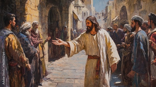 Fototapeta premium Jesus christ extending hand in welcome in jerusalem street
