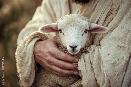 © Bargais, Fototapeta premium Jesus Christ gently holding a lamb.