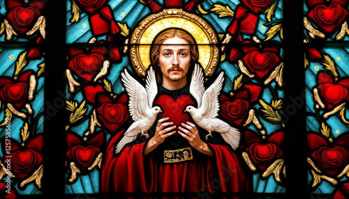 Naklejka premium Jesus Christ Holding Red Heart in Stained Glass