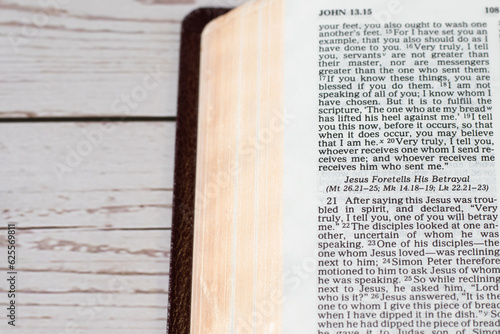 © Marinela, Obraz premium Jesus Christ's betrayal, biblical verses in open holy bible book on wooden table. A close-up.