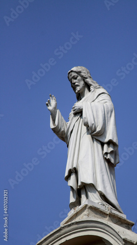 Fototapeta premium Jesus Christ statue atop a church with blue sky in the background - Savior...
