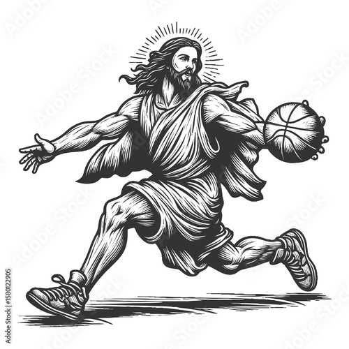 © Oleksandr Pokusai, Obraz premium Jesus in motion, dribbling a basketball while wearing robes and sneakers with radiant halo sketch engraving generative ai fictional character raster illustration. Scratch board. Black and white image.