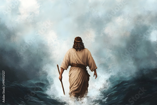 © AungThurein, Obraz premium Jesus miraculously walks on water across the sea