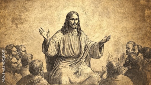 Fototapeta premium Jesus sits among his disciples, sharing wisdom and teachings about faith and...