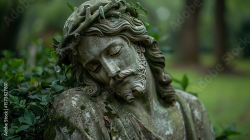 © NuriAlam, Obraz premium Jesus statue, crown of thorns, eyes closed, weathered, resting on greenery