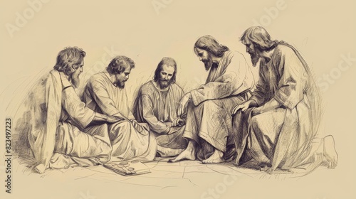 Fototapeta premium Jesus Washing the Feet of His Disciples, Biblical Illustration of Humility and Service, Perfect for Religious Stock Photography