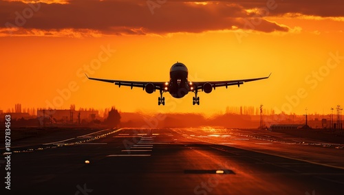 © Taufik, Fototapeta premium Jet plane ascends into a vibrant sunset over a runway