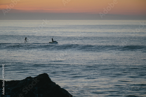 Obraz premium Jet ski towing a foil surfer during the sunset on atlantic ocean