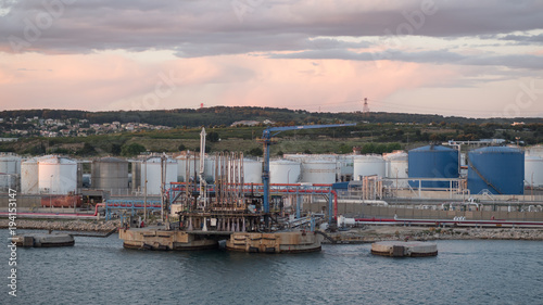 Fototapeta premium Jetty of LPG LNG marine terminal in sunset