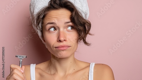 © Studio Zenith, Fototapeta premium Jeune femme avec rasoir regardant vers le haut sur fond rose pastel