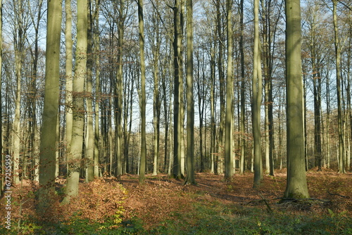 © Photocolorsteph, Obraz premium Jeunes hêtres au troncs très élancés dans la forêt de Soignes en fin d'automne à Groenendael au sud-est de Bruxelles