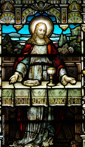 © Howgill, Obraz premium Jeuss with braed and a cup of wine in stianed glass