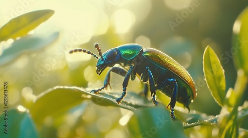 Fototapeta premium Jewel beetle crawling sunlit leaf, garden bokeh, nature poster