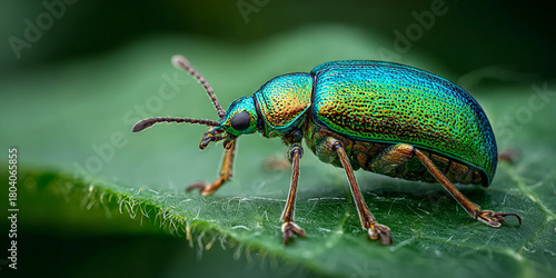 © surachai, Fototapeta premium Jewel Beetle on Leaf: Iridescent Macro